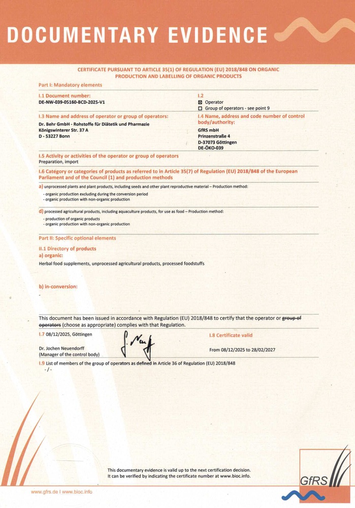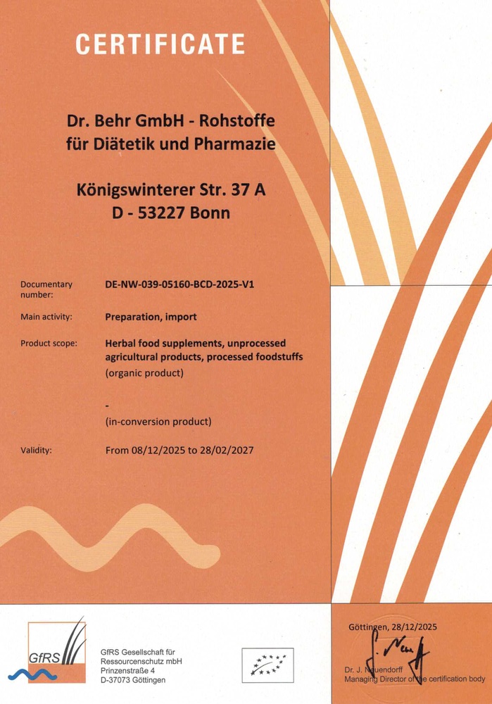 Nasze surowce roślinne z aktualnego wykazu asortymentu, oznaczone logo UE dla produktów ekologicznych, poddane zostały certyfikacji przez GfRS i dopuszczone do handlu produktami ekologicznymi w myśl Rozporządzenia (WE) nr 834/2007.